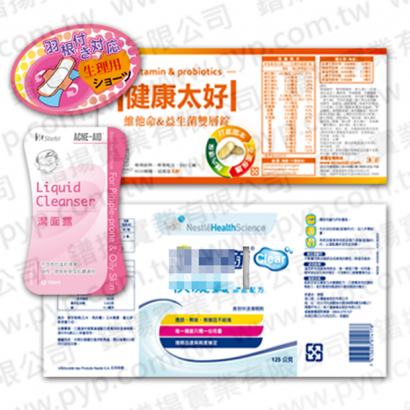 提供各式化妝品貼紙、美容美髮貼紙、健康食品貼紙、醫藥生技貼紙。為順應潮流防止仿冒,可於貼紙上加印防偽設計,並可於局部加工燙金、擠凸及印製條碼及流水序號。